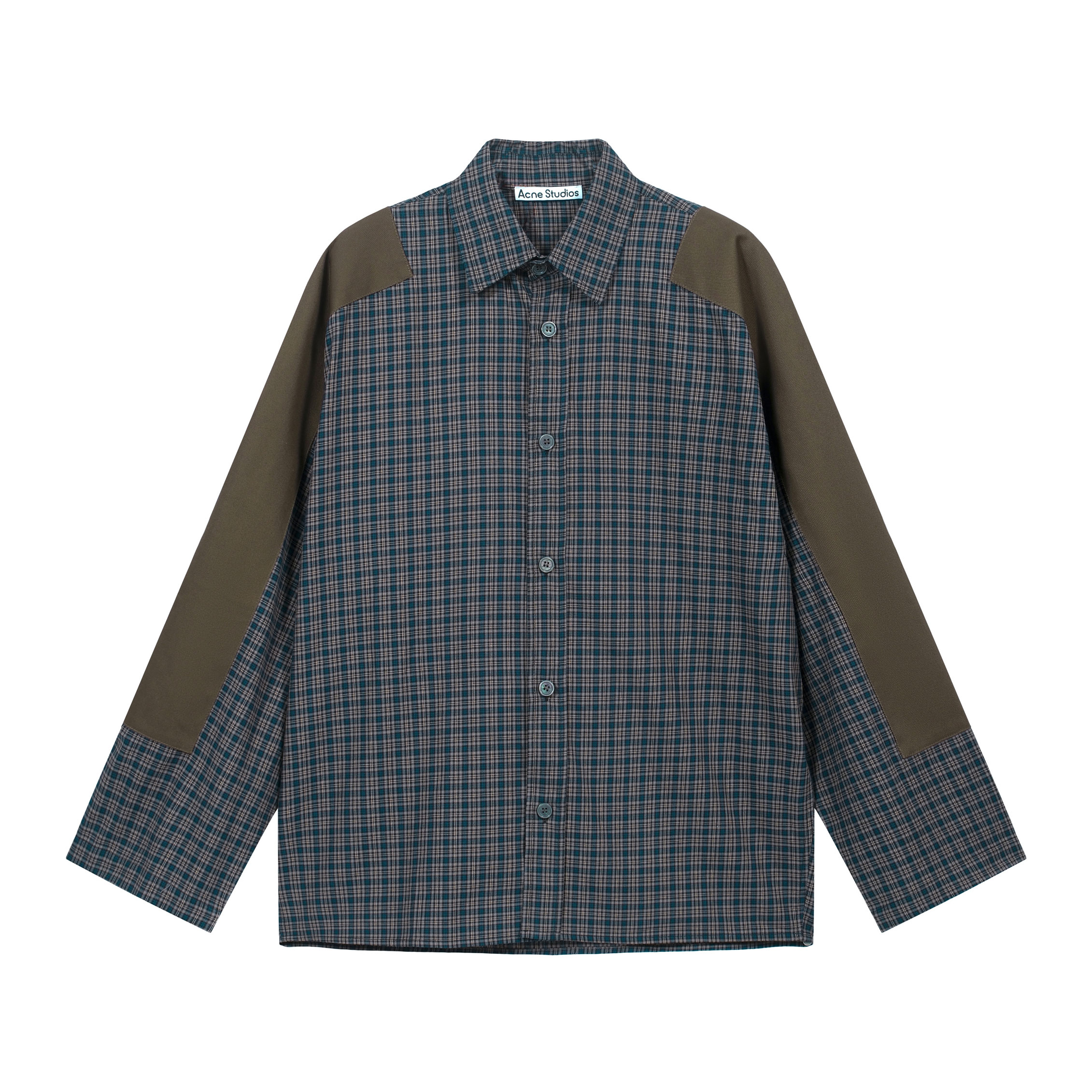 Styling: Full button-down front, pointed collar, buttoned cuffs, unique contrast color paneling on the upper shirt/sleeves.
