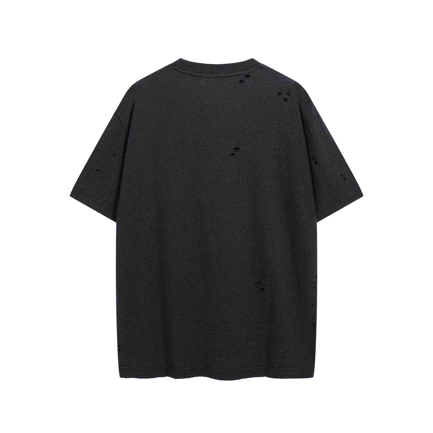 Features: Crew neck, dropped shoulders, distressed detailing (holes/tears) on the fabric, and a 'sprayed' or faded finish.