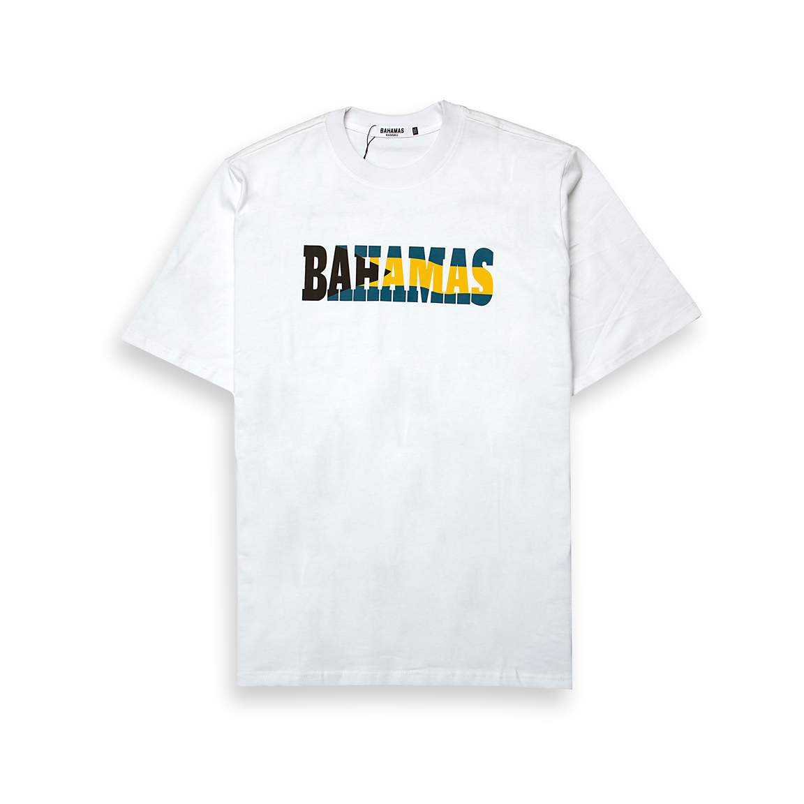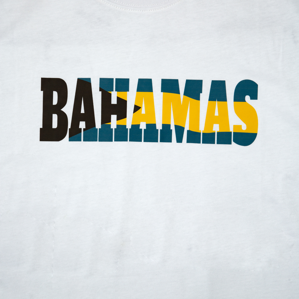 Details: Crew neck, short sleeves, "BAHAMAS" text graphic on the chest with the country's flag colors used as a fill pattern.