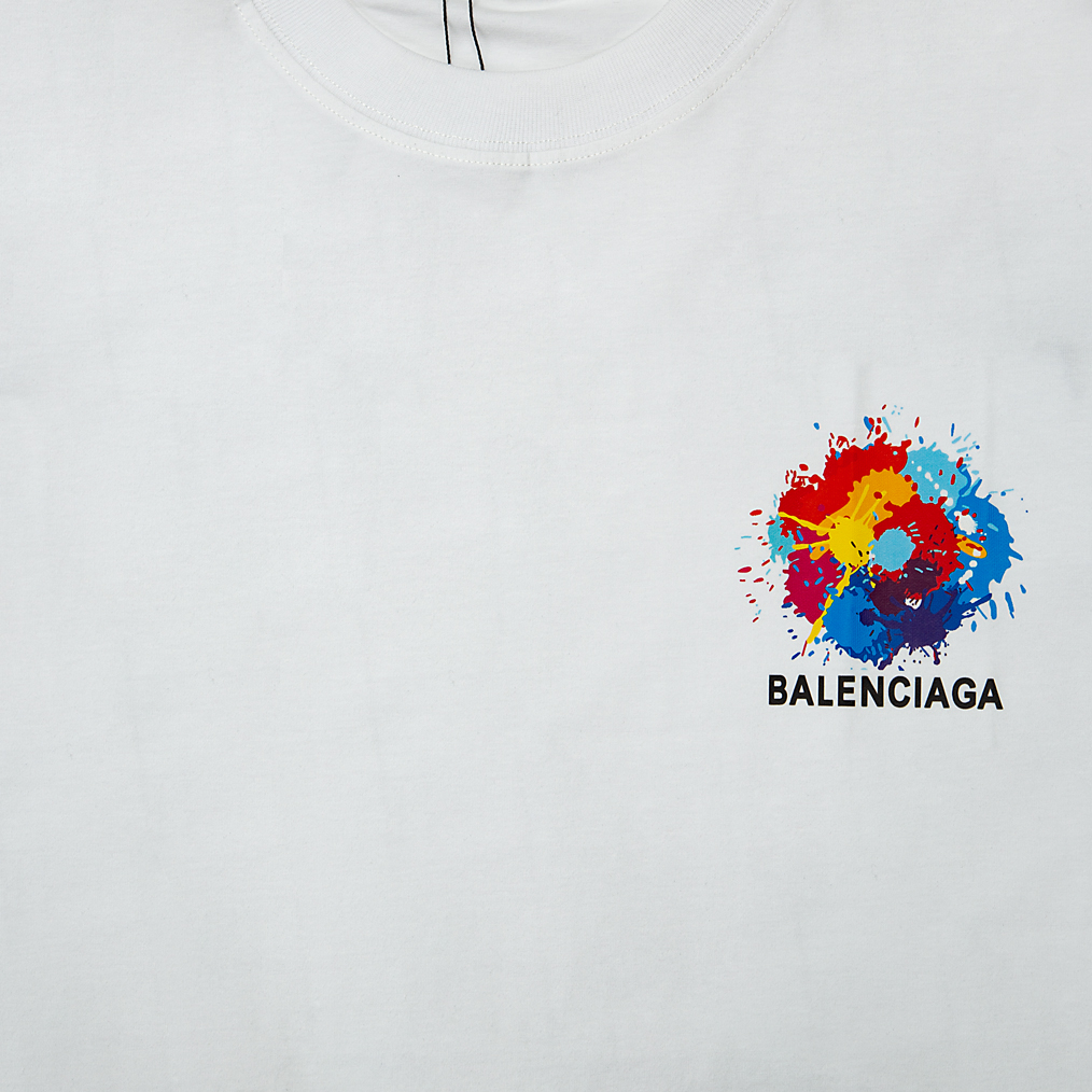 Design: Ribbed crew neck, straight hem, and an impactful, high-quality multi-colour paint splatter graphic on the chest with the Balenciaga logo.