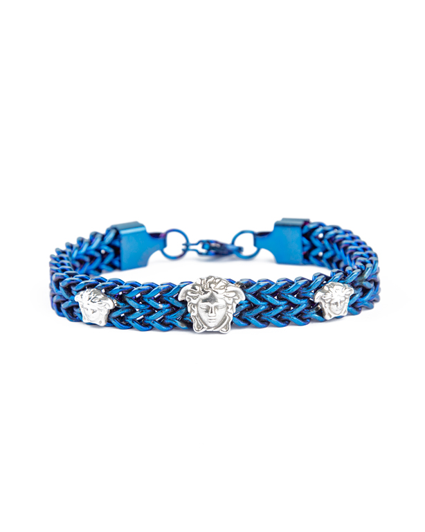 Details: Braided/woven metal design, Medusa head medallions, clasp closure.