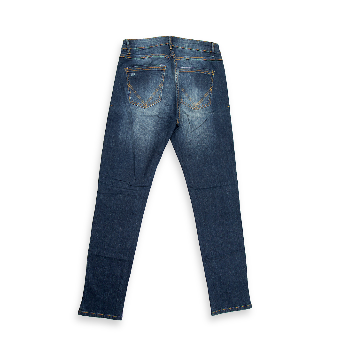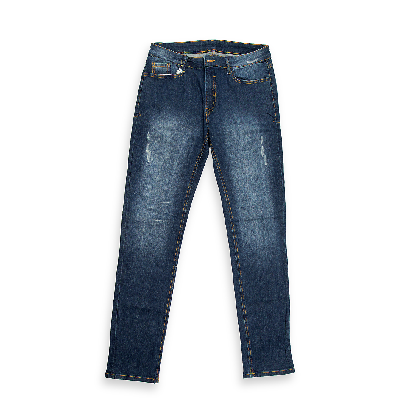 Features: Five-pocket styling, zip fly, button closure, light distressing (abrasions), fading, contrast stitching, belt loops.
