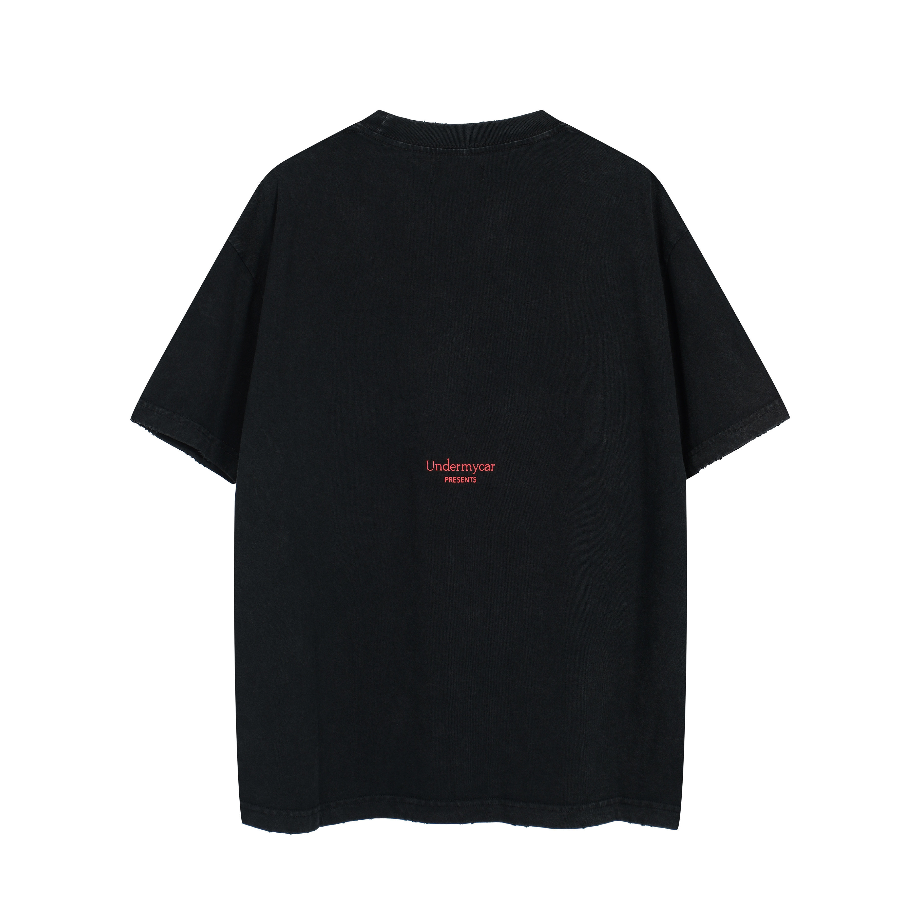 Fabric: Medium-to-heavyweight cotton or cotton blend, treated with a pigment dye or acid wash for the washed black/vintage look.