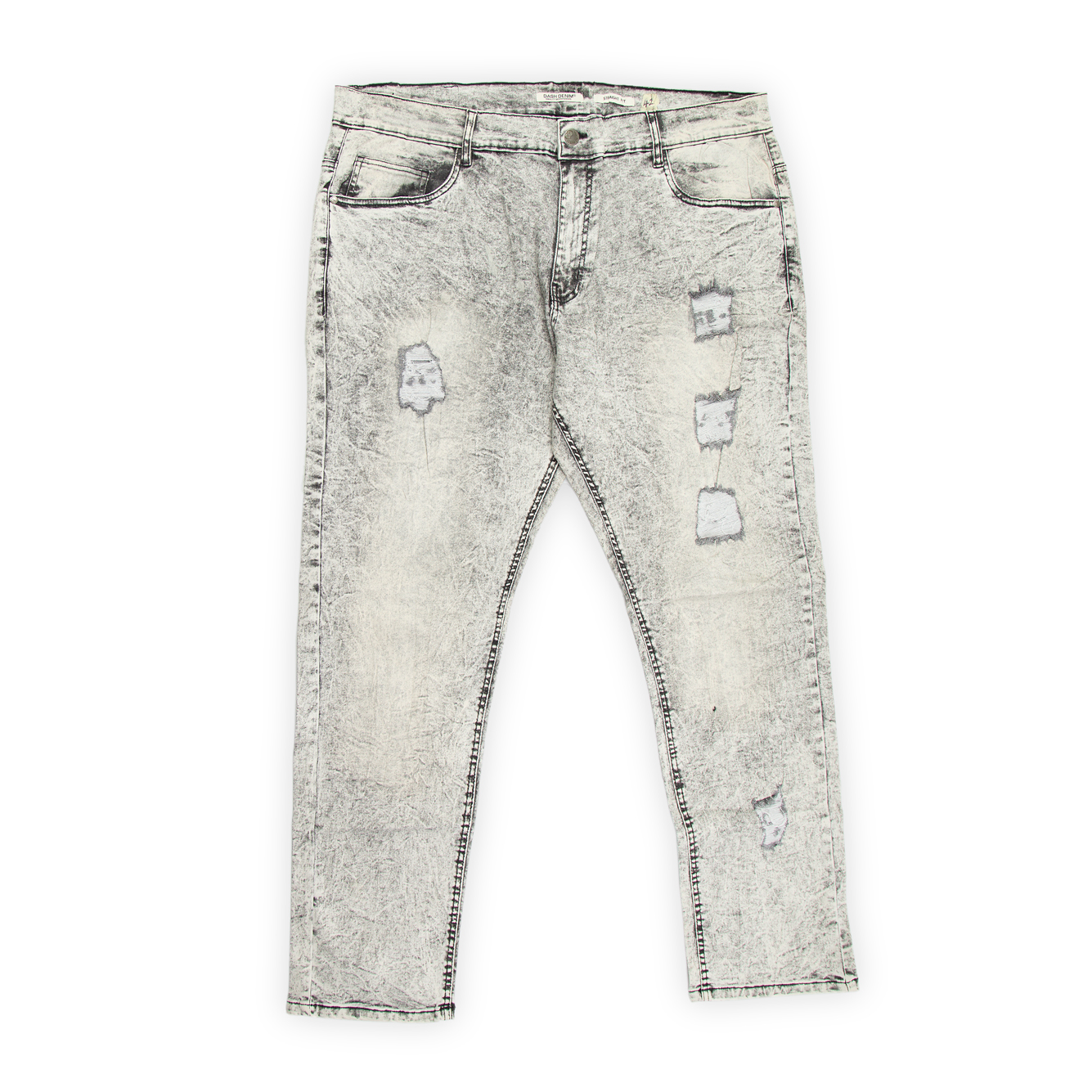 Features: Five-pocket styling, zip fly, button closure, heavy grey acid wash, moderate front distressing/rips, belt loops.