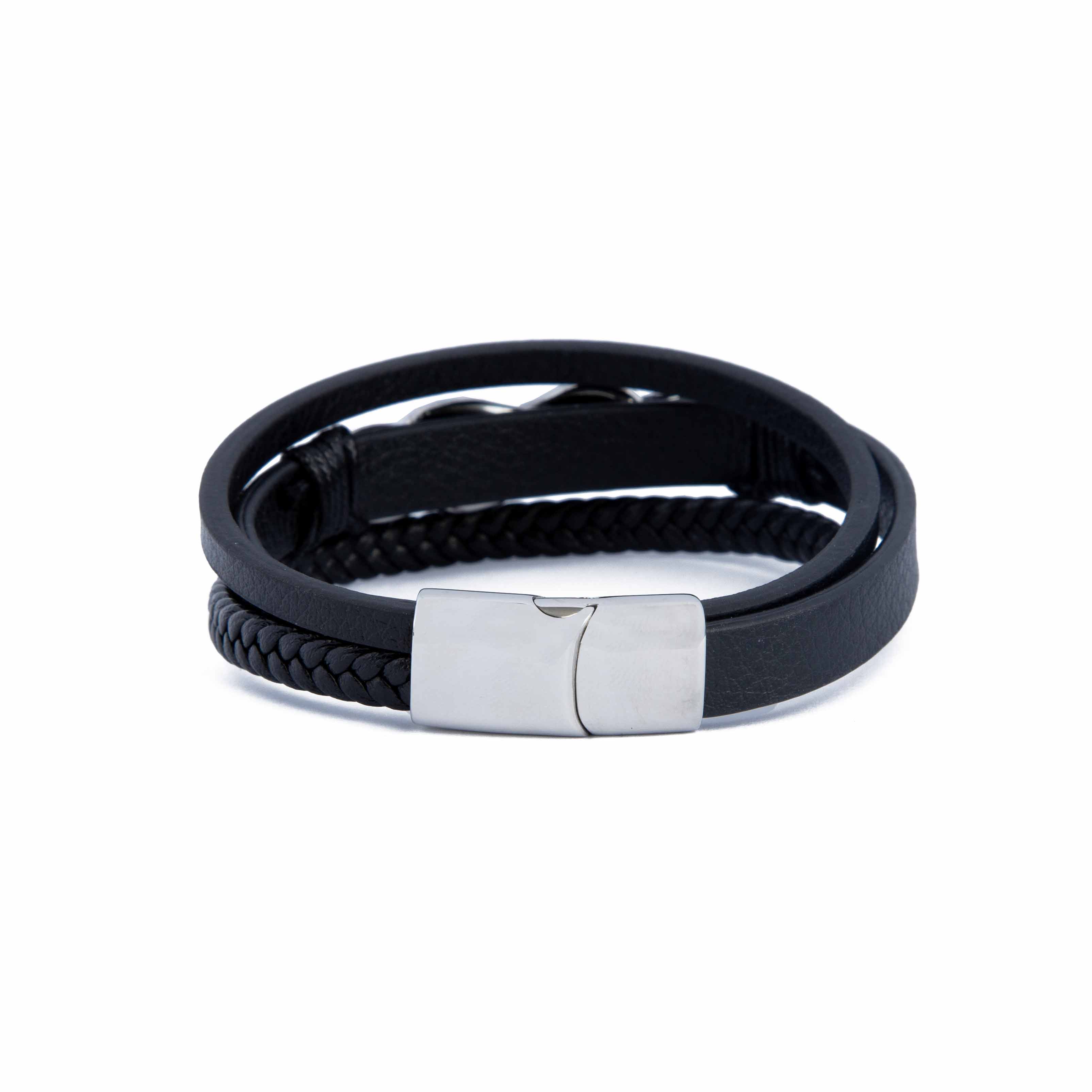 Design: Multi-layered bracelet with three distinct leather strands and a central silver-toned infinity knot charm.