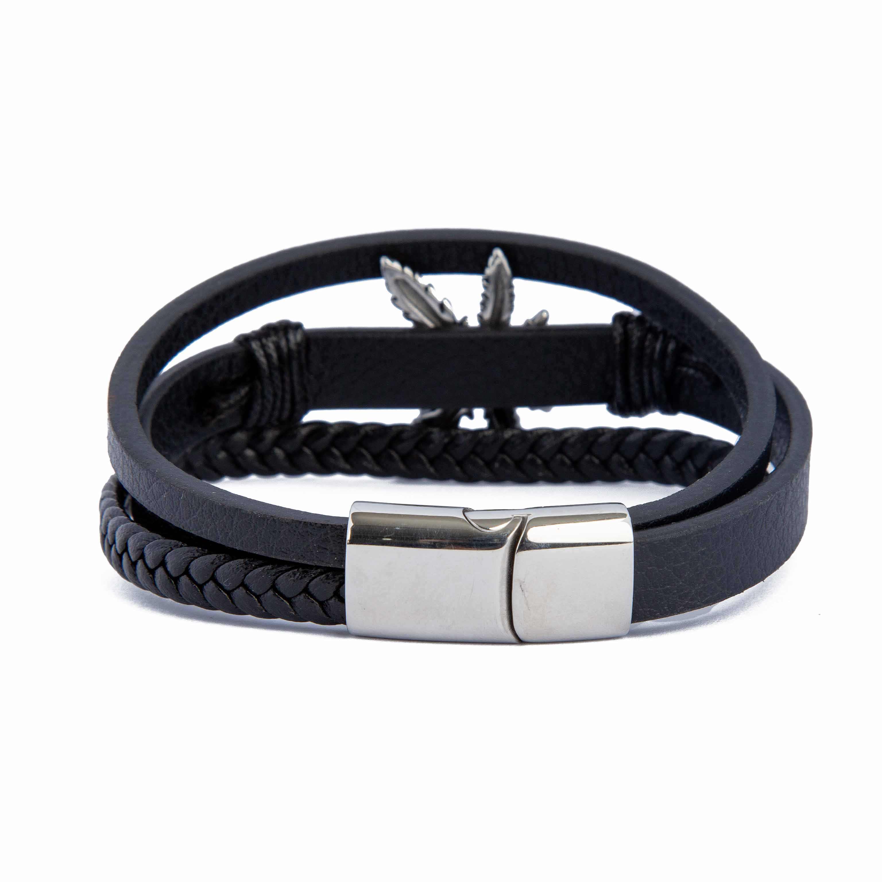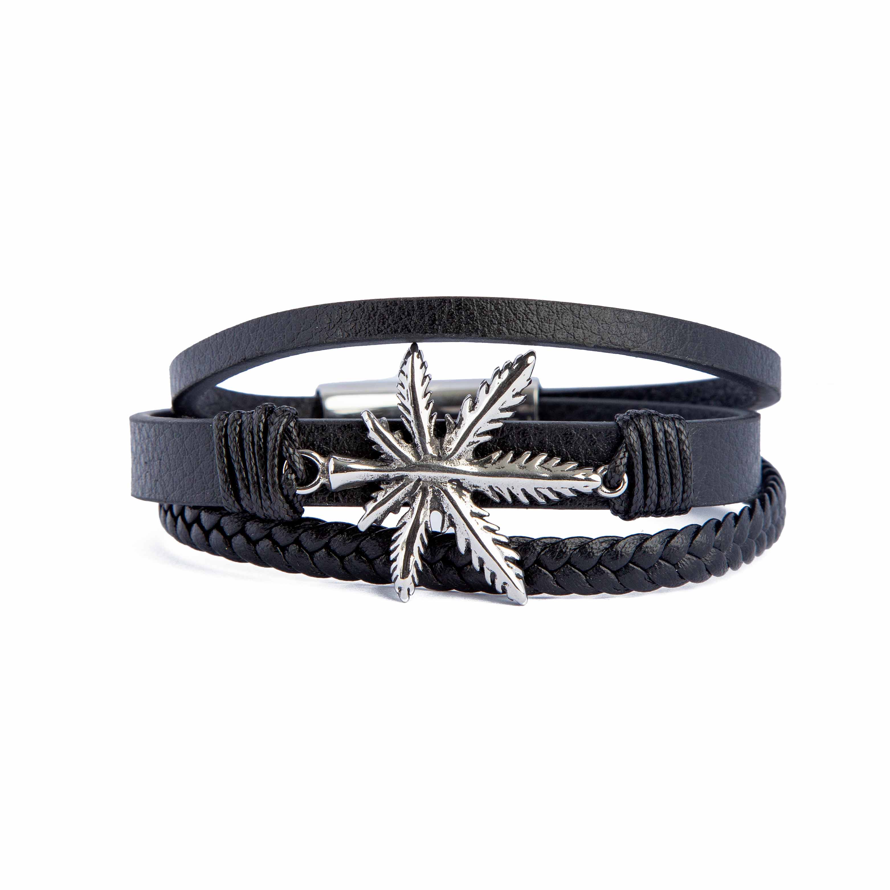 Design: Multi-layered bracelet with three distinct leather strands and a central silver-toned leaf charm.