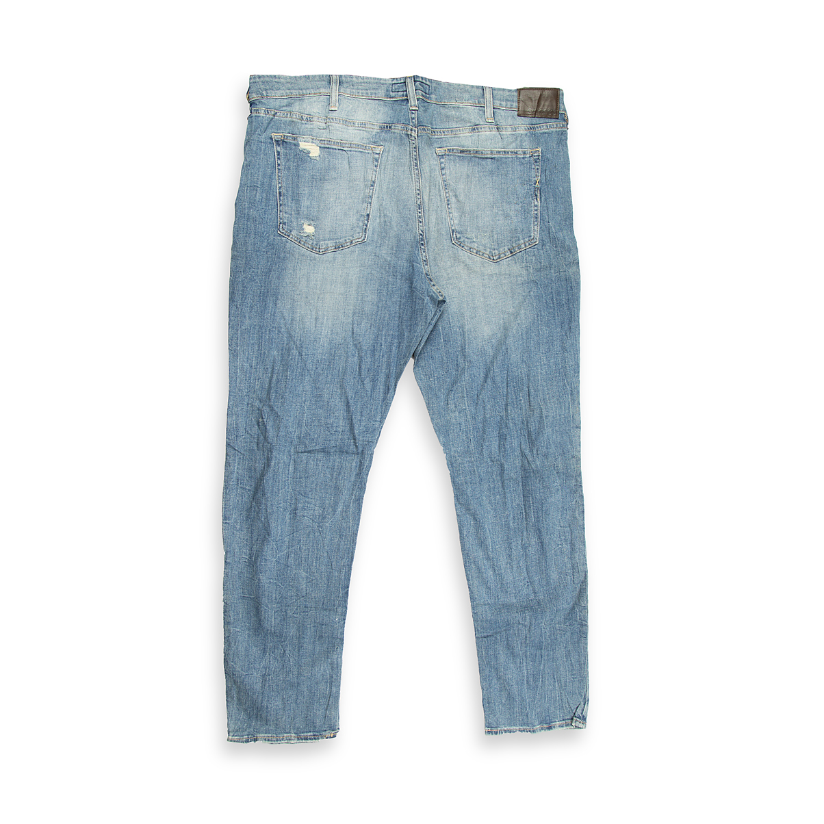 Features: Five-pocket styling, zip fly, button closure, heavy distressing (rips and tears), light blue wash, whiskering, belt loops.