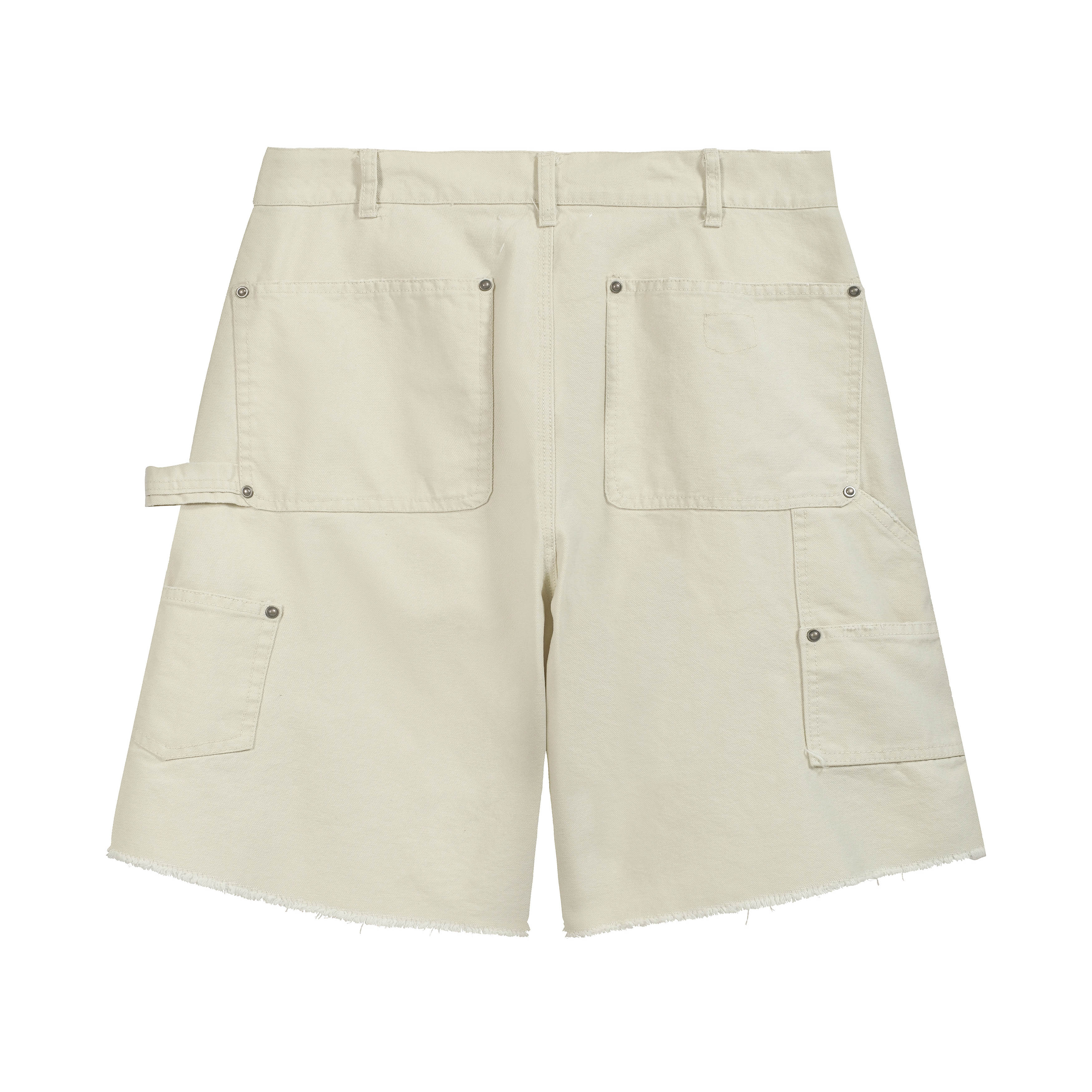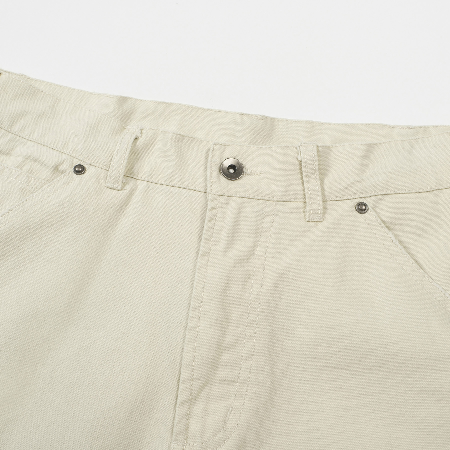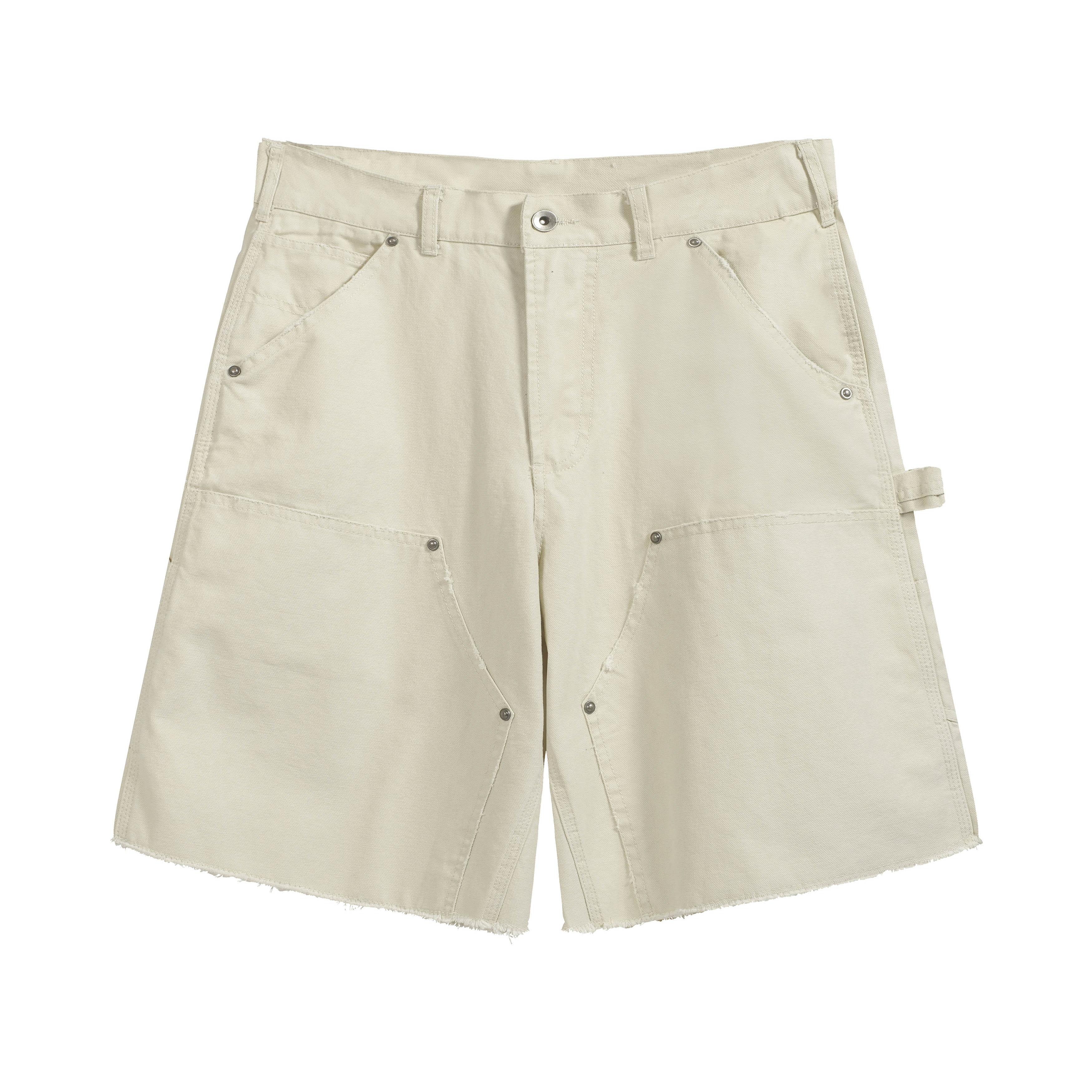 Details: Multiple panels and seams, metal rivet reinforcements, slant pockets, and a raw/frayed hem.