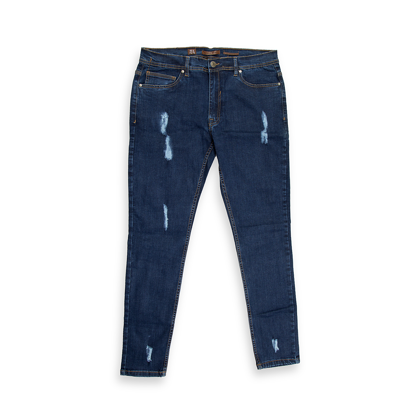 Details & Care Description Material Cotton/Polyester/Elastane Blend (Stretch Denim) ClosureZip fly and button closurePockets Classic Five-Pocket Styling Fit Skinny Fit (Sits below the waist) Detailing Light whiskering, distressed patches (not fully ripped through) Washing Machine wash cold inside-out, gentle cycle, with like colors.Drying Tumble dry low or line dry to maintain color.Ironing Iron on low heat if needed. Do not bleach.