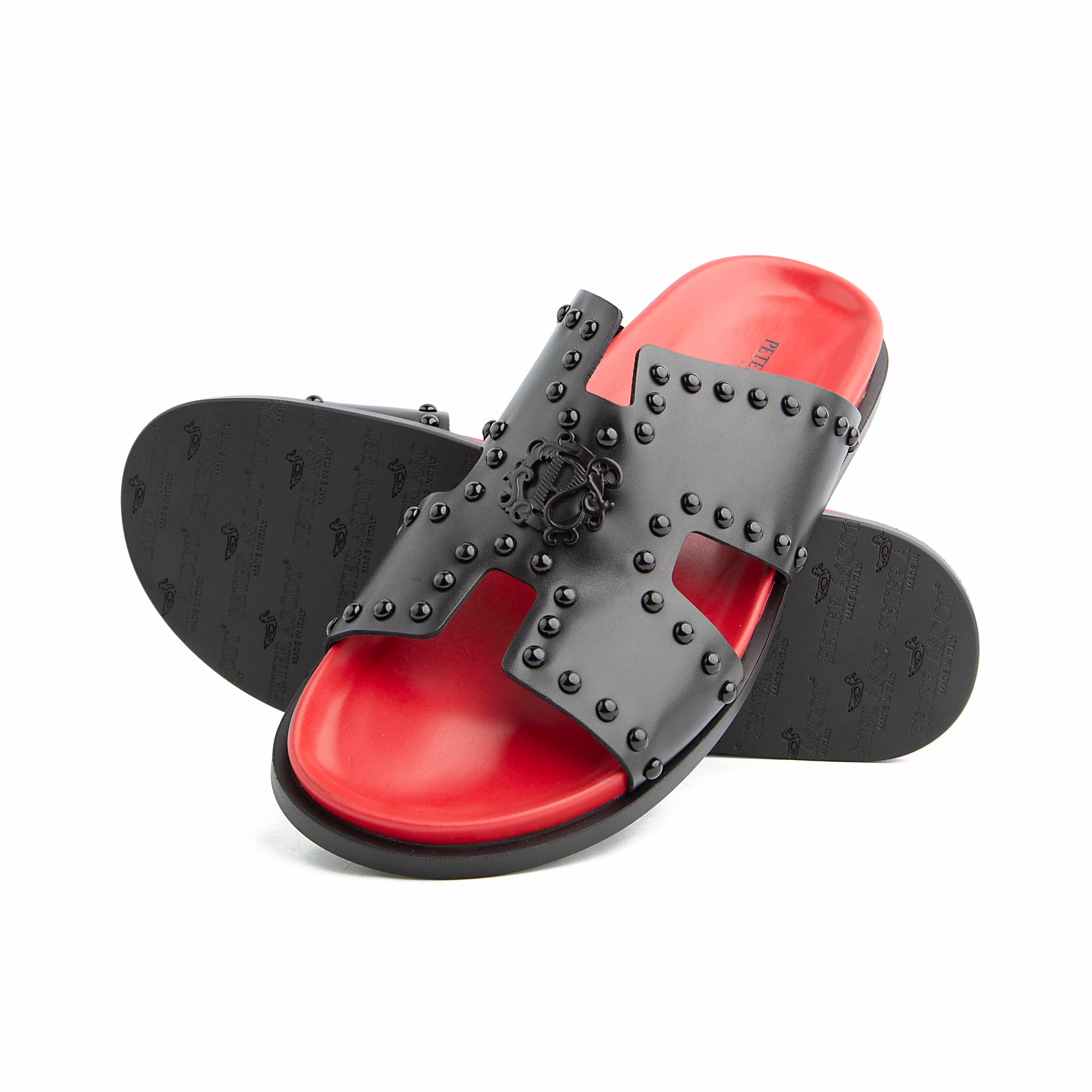 Material: 100% genuine leatherDesign: Wide slide straps embellished with black studs and a prominent Peter Ascot emblem; contrasting red footbed.To clean, gently wipe the black leather straps with a soft, slightly damp cloth. Avoid harsh cleaners on the red footbed, using a mild soap solution if necessary and wiping dry promptly. Keep away from direct sunlight and extreme heat to prevent fading. Store in a cool, dry place.