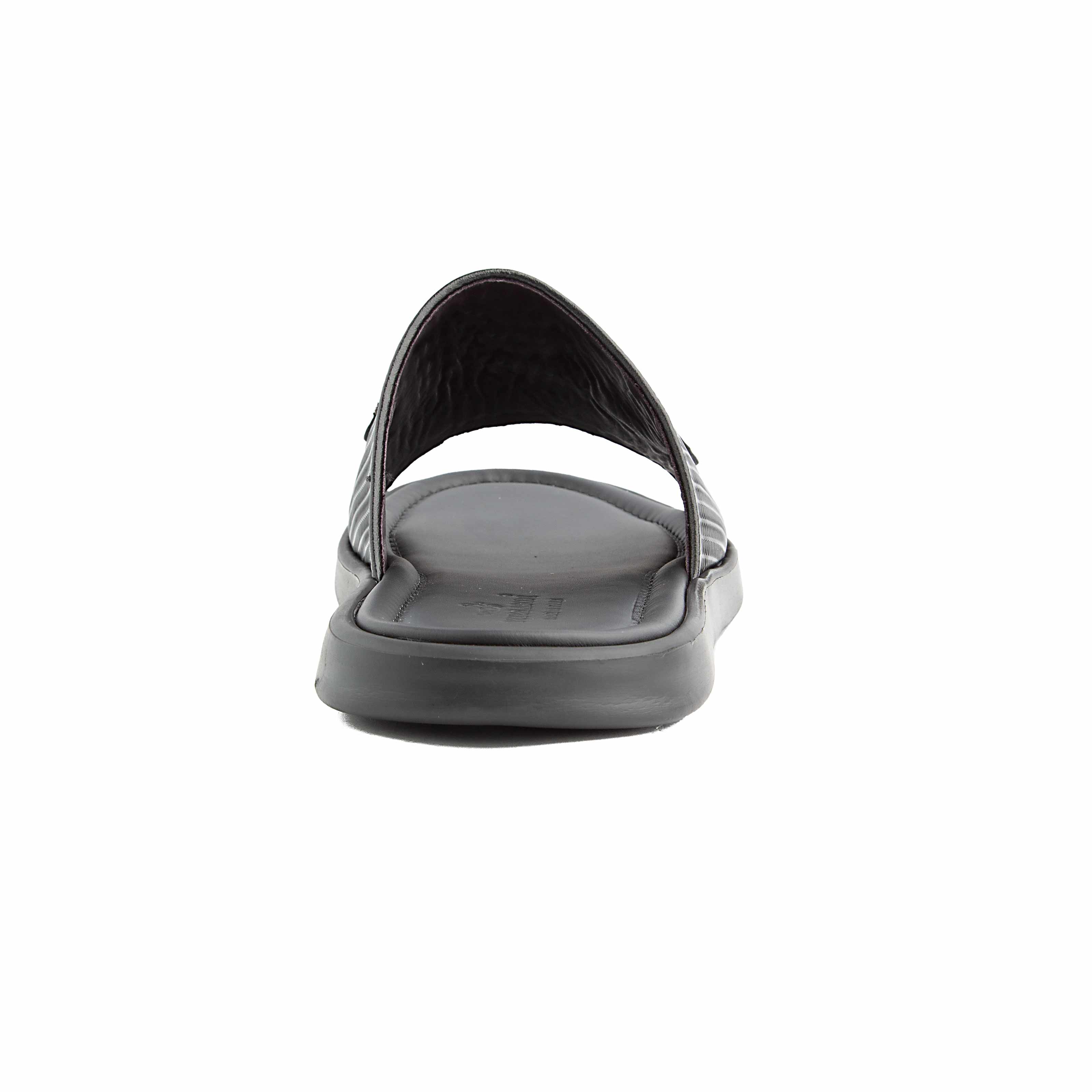 Material: 100% genuine leather.Design: Wide slide strap with a textured pattern and a prominent gold-toned horse-bit buckle detail..To clean, gently wipe the black leather straps with a soft, slightly damp cloth. Avoid harsh cleaners on the red footbed, using a mild soap solution if necessary and wiping dry promptly. Keep away from direct sunlight and extreme heat to prevent fading. Store in a cool, dry place.