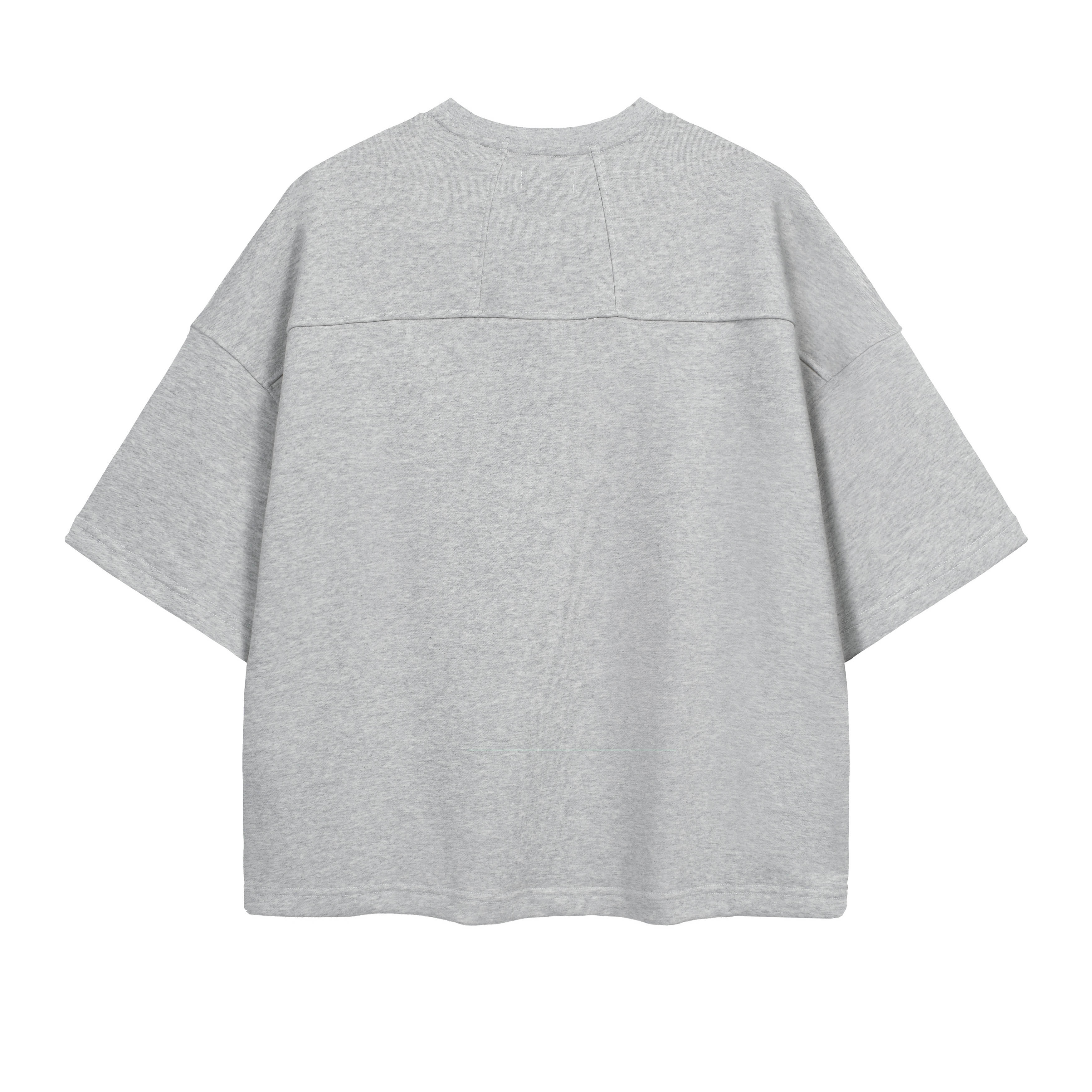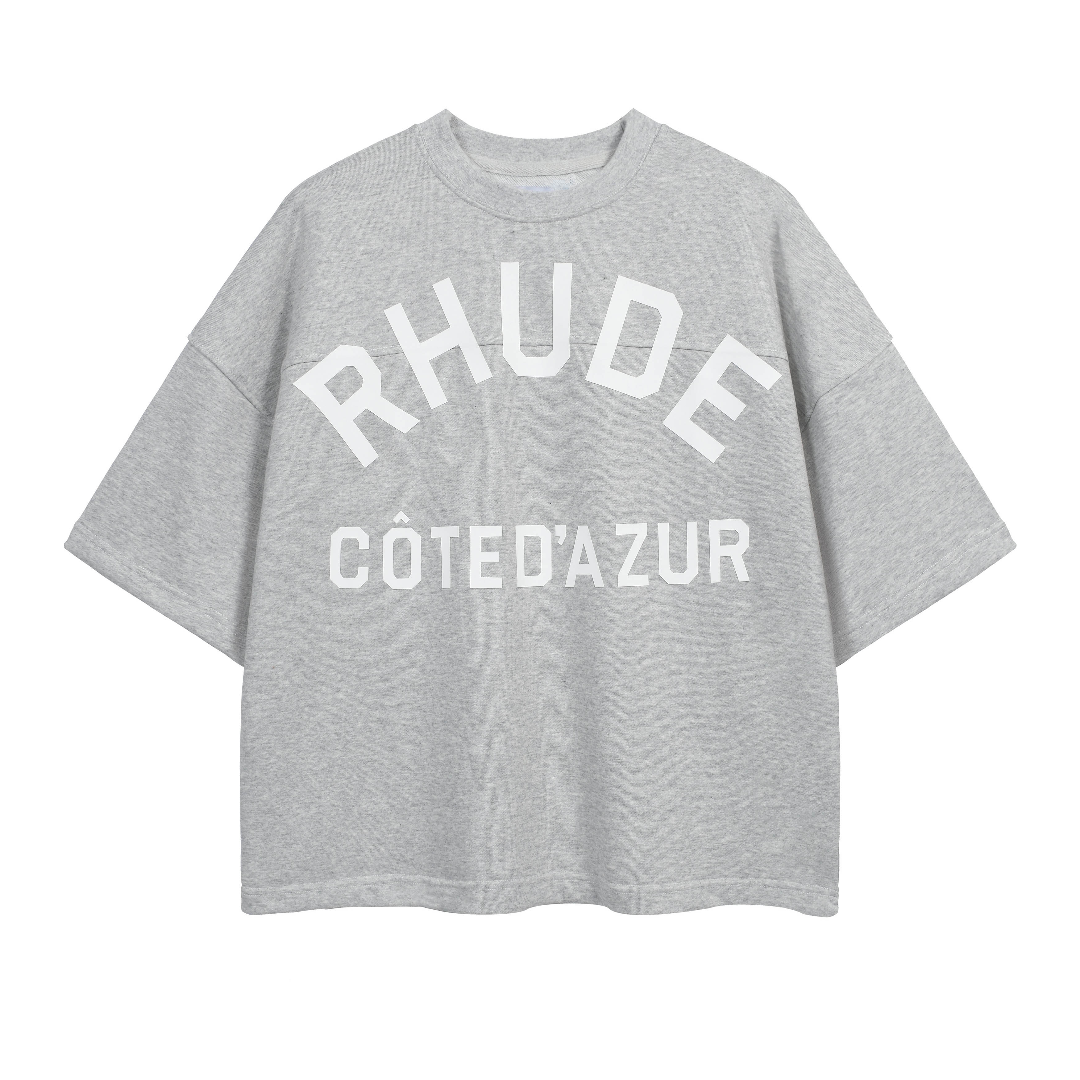 Details:Material : A Heavy Cotton Jersey or Terry Cloth.Fit : Relaxed / Boxy Crewneck Fit with wide shoulders.Neckline : Ribbed collar, clean hem.Design: Short sleeves with a two-line collegiate-style graphic. Care Description