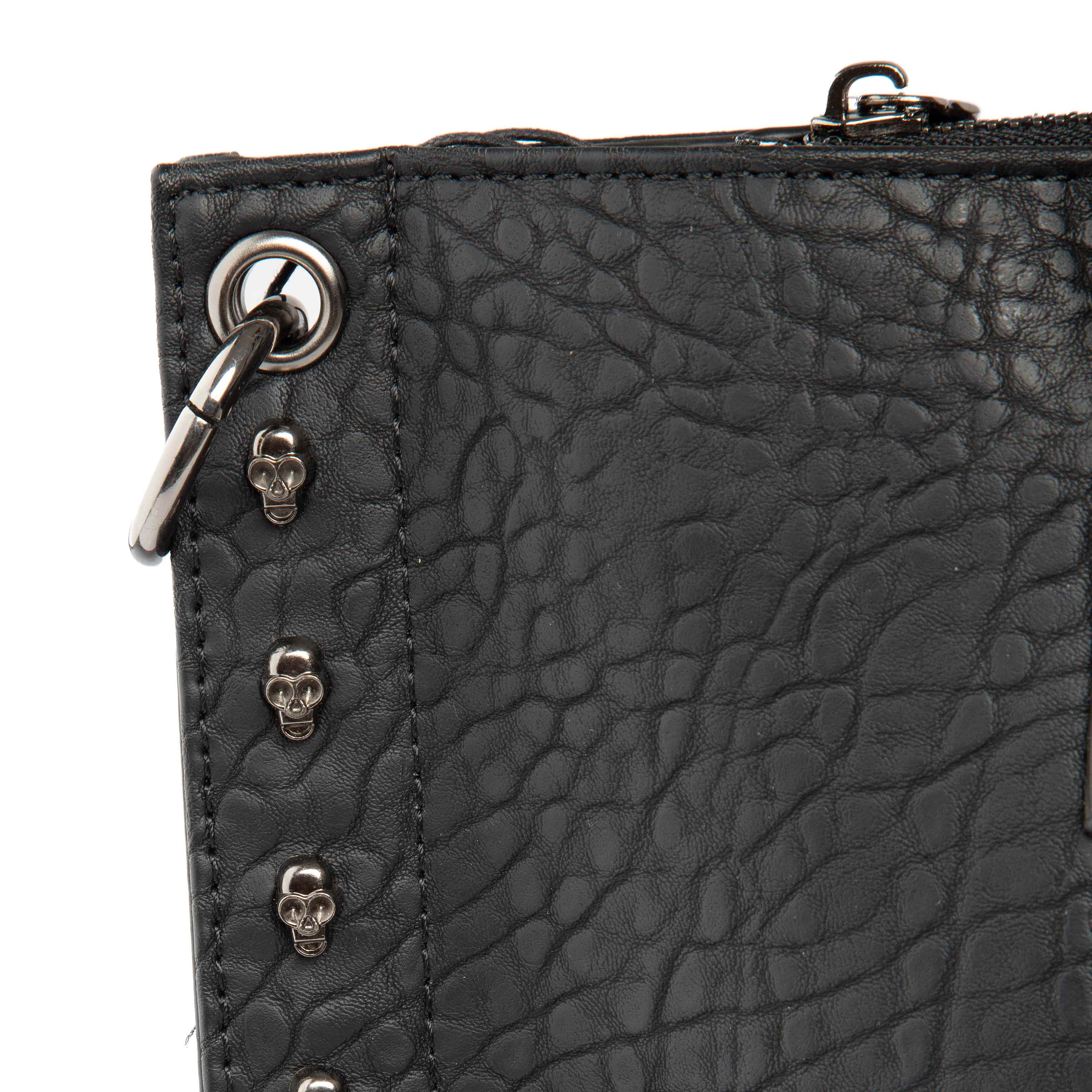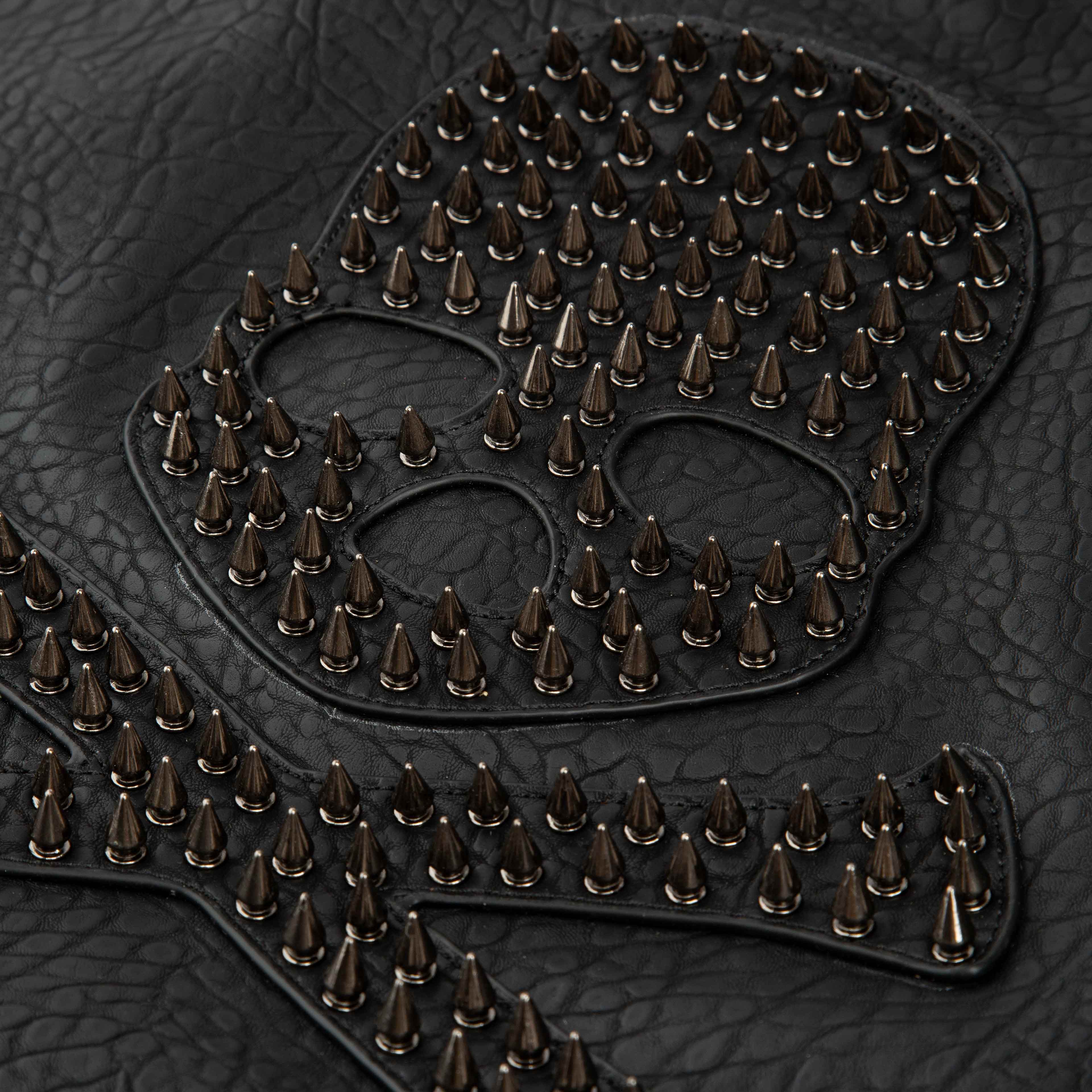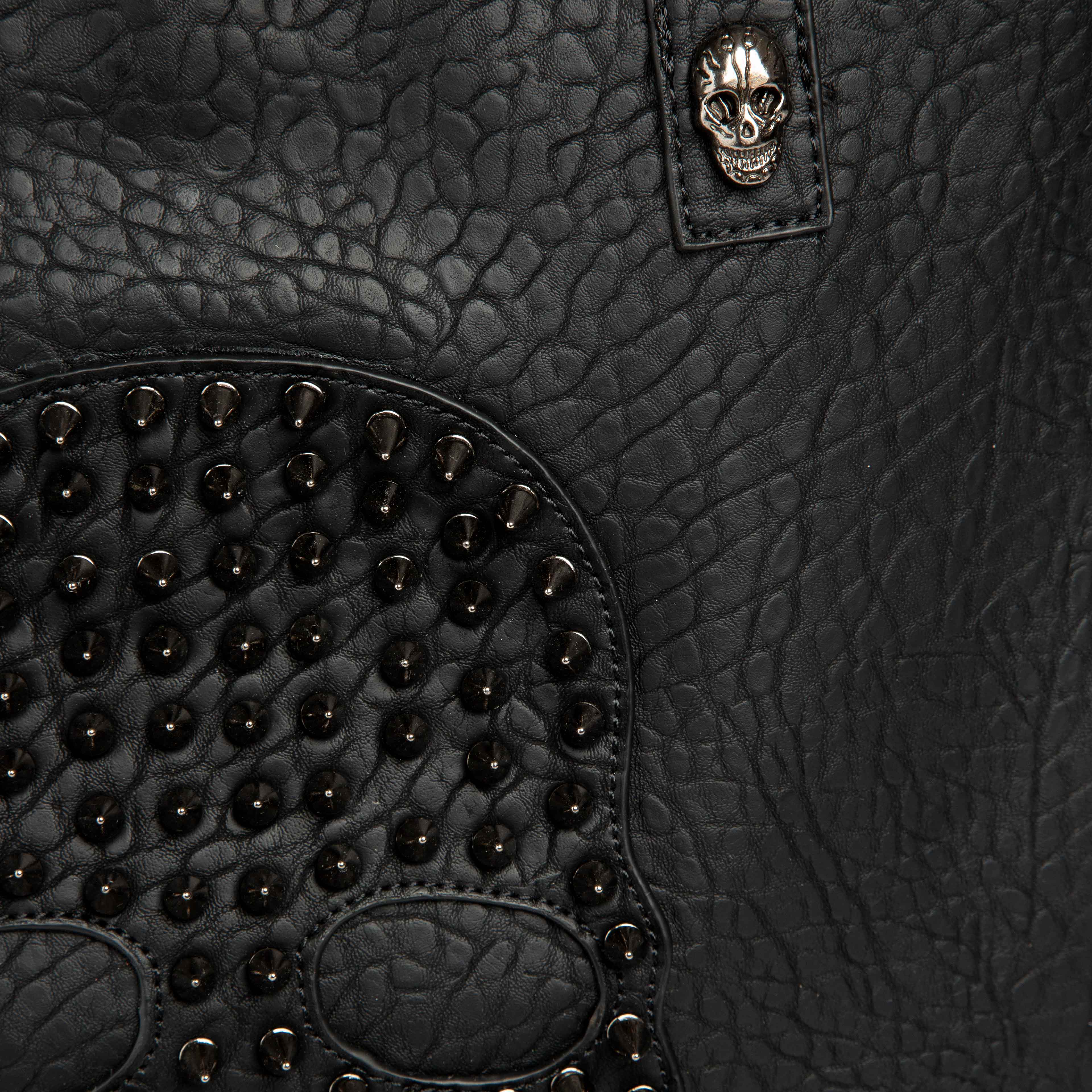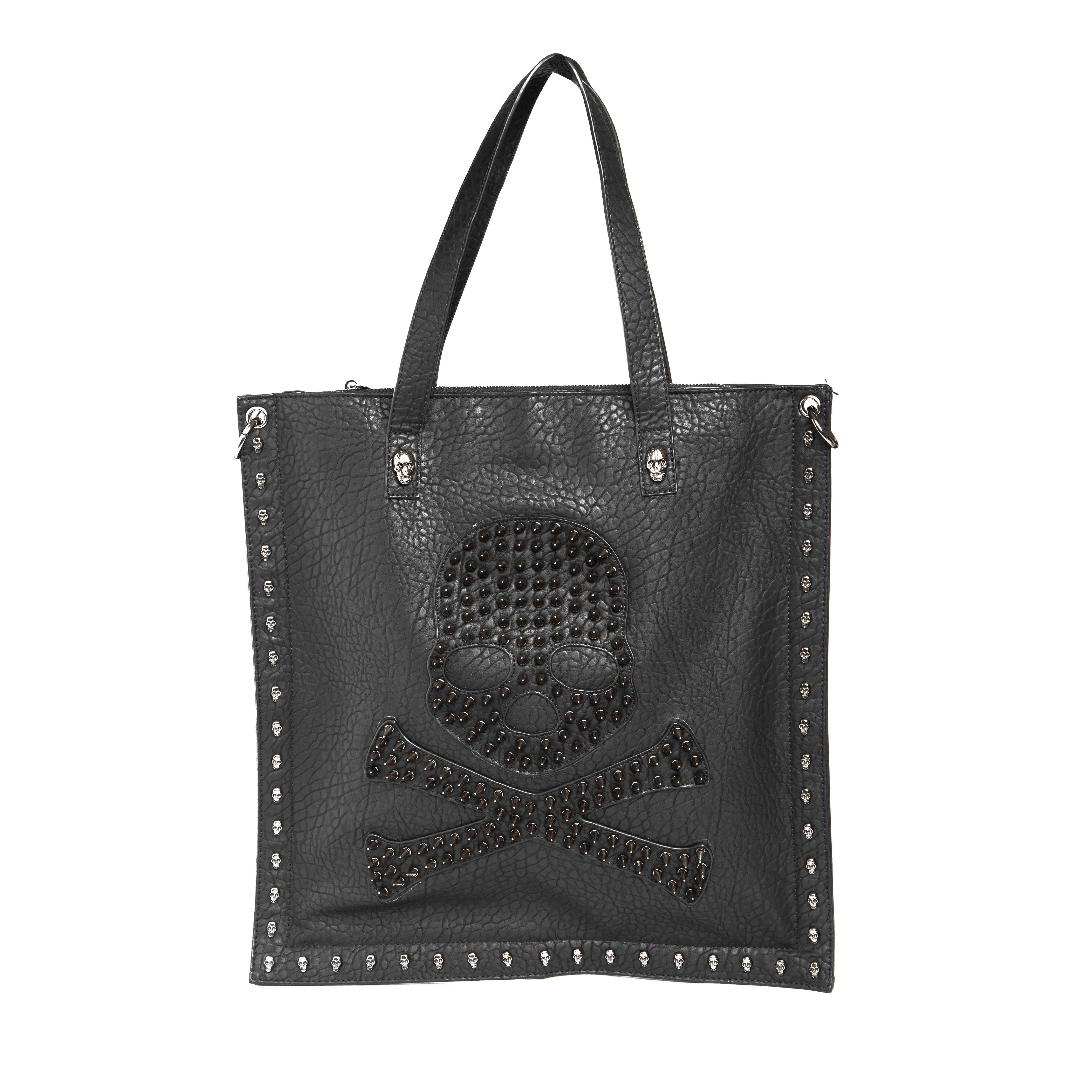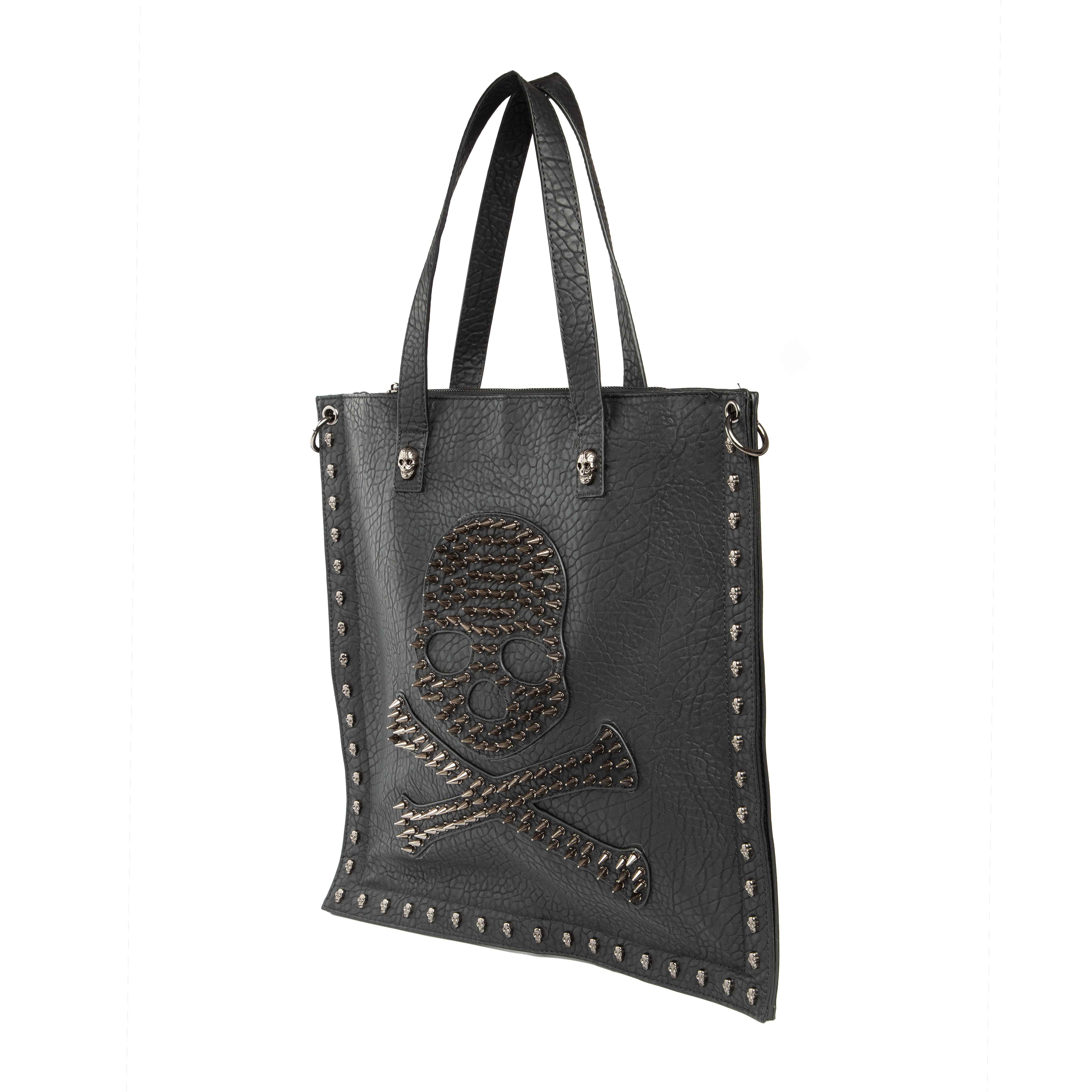 Design Elements: Features a large skull and crossbones design made from rounded and pyramid studs. The perimeter of the bag is also adorned with smaller studs and skull-shaped embellishments.Closure: Likely a top zipper closure to secure contents, though not fully visible in the image.Handles: Equipped with durable top handles for comfortable hand or shoulder carrying. D-rings on the sides suggest it might also come with a detachable, adjustable shoulder strap (not visible).Interior: Typically features a main compartment, possibly with a fabric lining and small internal pockets for organization.
