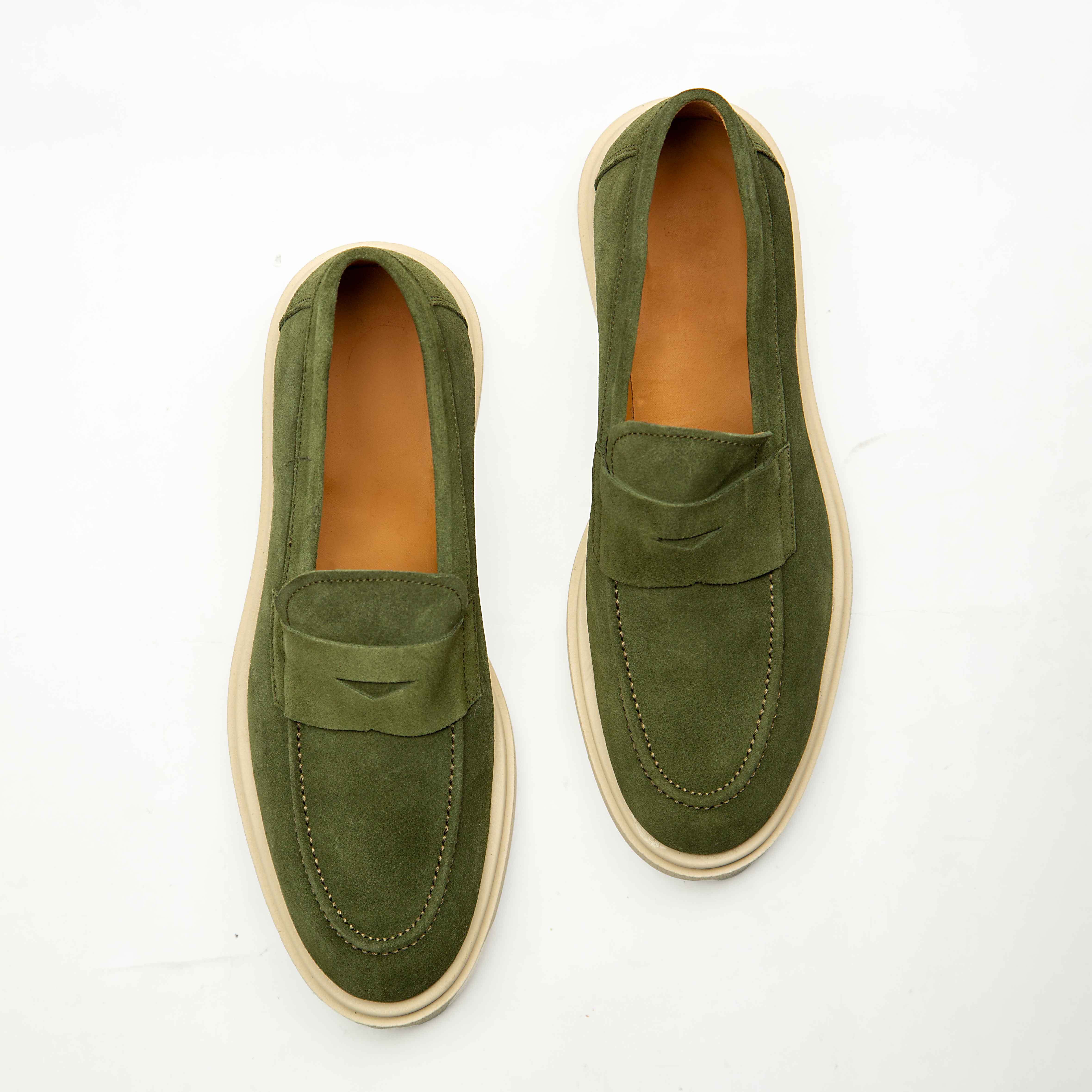 Agu & Sons Ltd olive green suede penny loafers featuring a thick cream platform rubber sole, isolated on a white background.Agu & Sons Ltd olive green suede penny loafers featuring a thick cream platform rubber sole, isolated on a white background.Agu & Sons Ltd olive green suede penny loafers featuring a thick cream platform rubber sole, isolated on a white background.