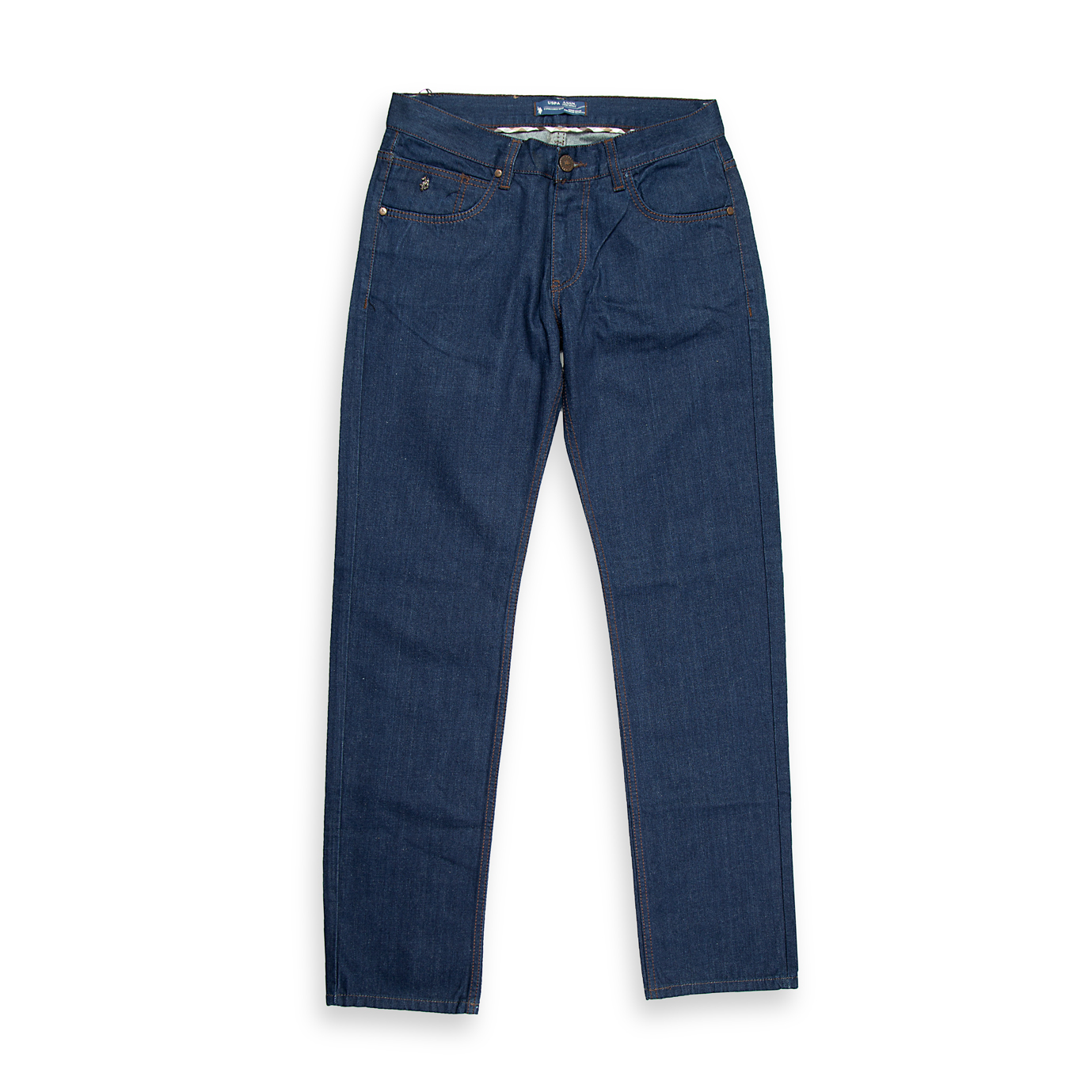 Styling: Uniform dark rinse color, high-contrast stitching (typically gold/orange), button and zipper fly closure.
