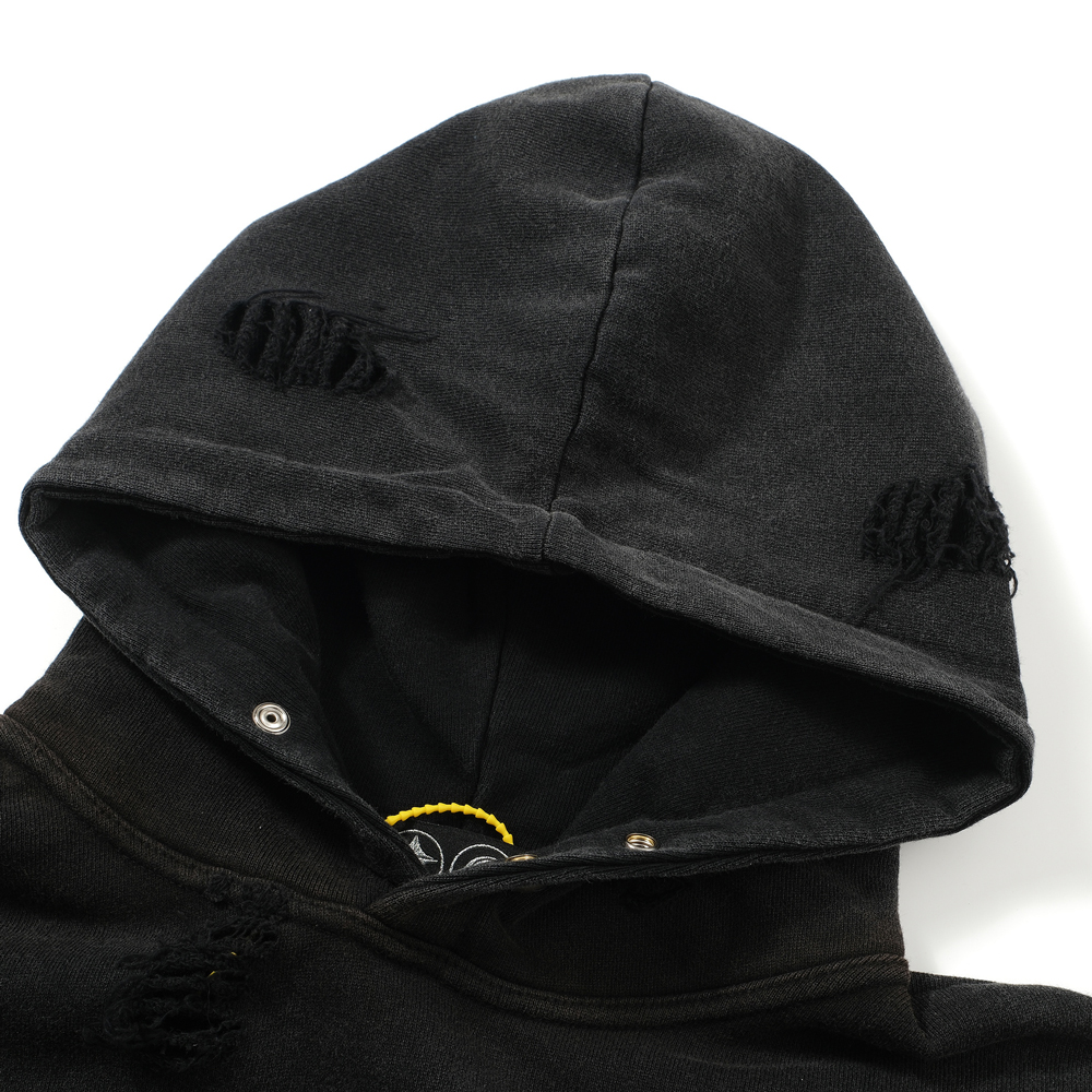 Fabric: Heavyweight cotton fleece or jersey with a pigment dye or washed treatment for a faded, vintage black colour.